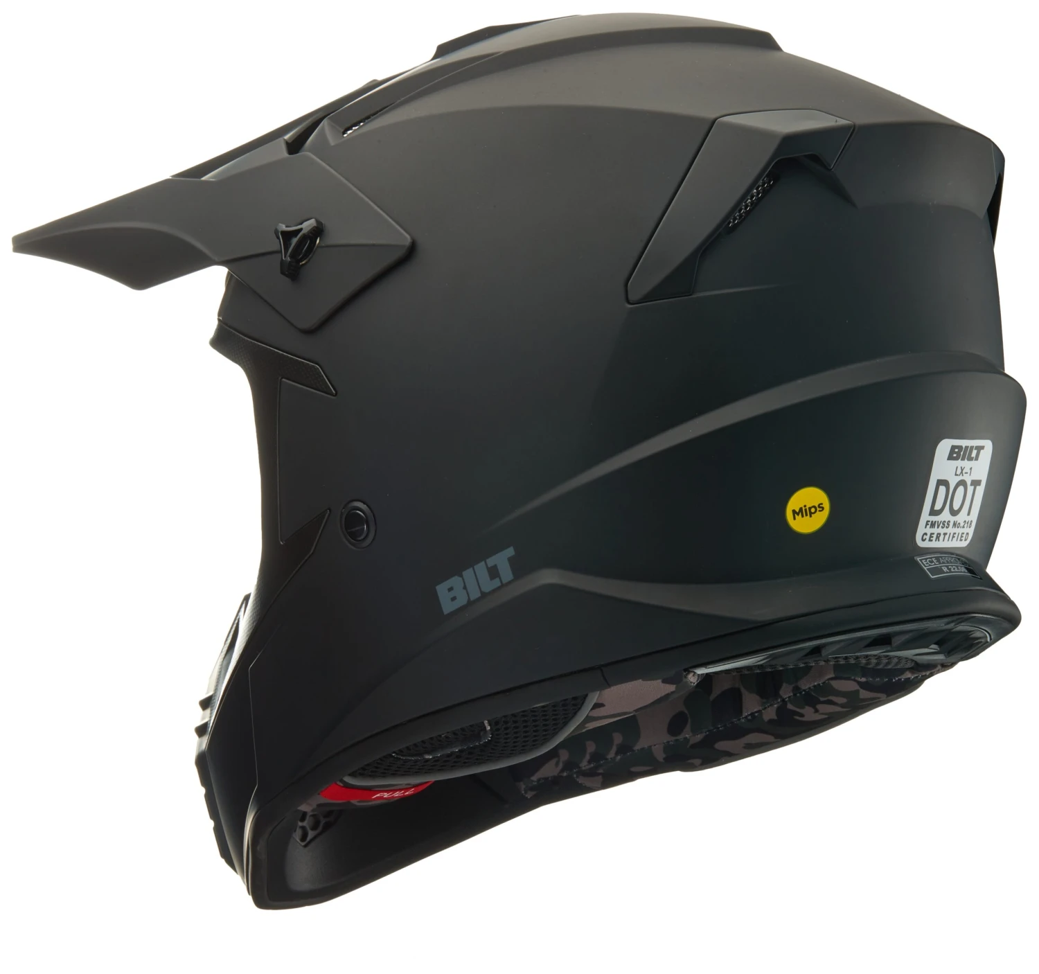 The BILT LX-1 Mips Helmet uses a lightweight injection-molded ABS shell and Multi-Directional Impact Protection System (Mips) to provide you top notch safety. Max flow chin ventilation with roost filter combined with with multi-channeled EPS flows air throughout the helmet to keep your noggin cool. The removable liner and cheek pads are moisture-wicking and are uniquely engineered for comfort and airflow – keeping you cool and focused. The aero-tuned sun peak is fully removable, and the LX-1 is both DOT and ECE approved.