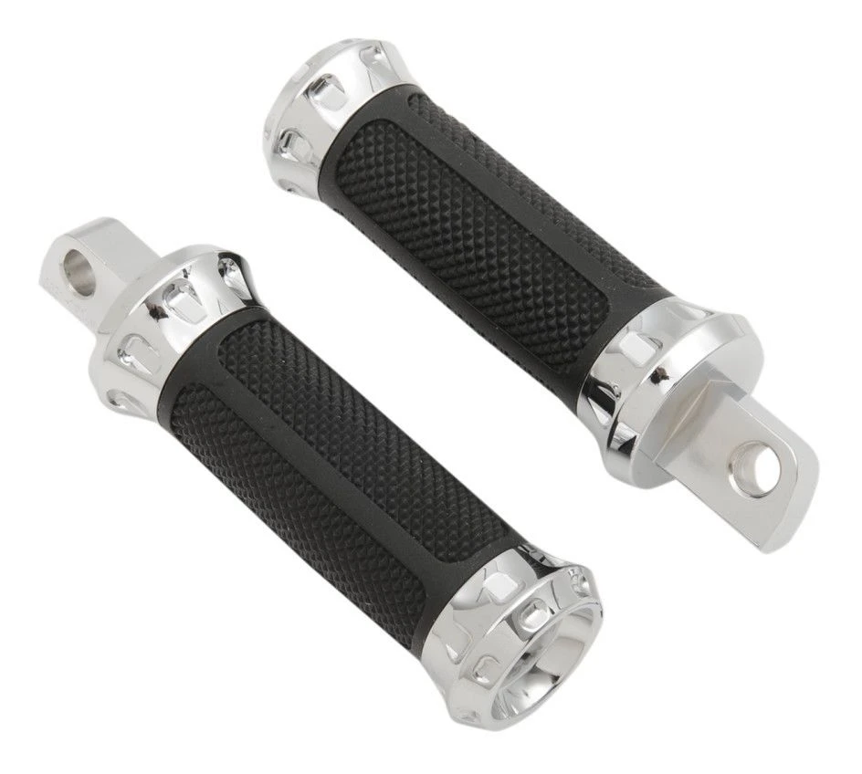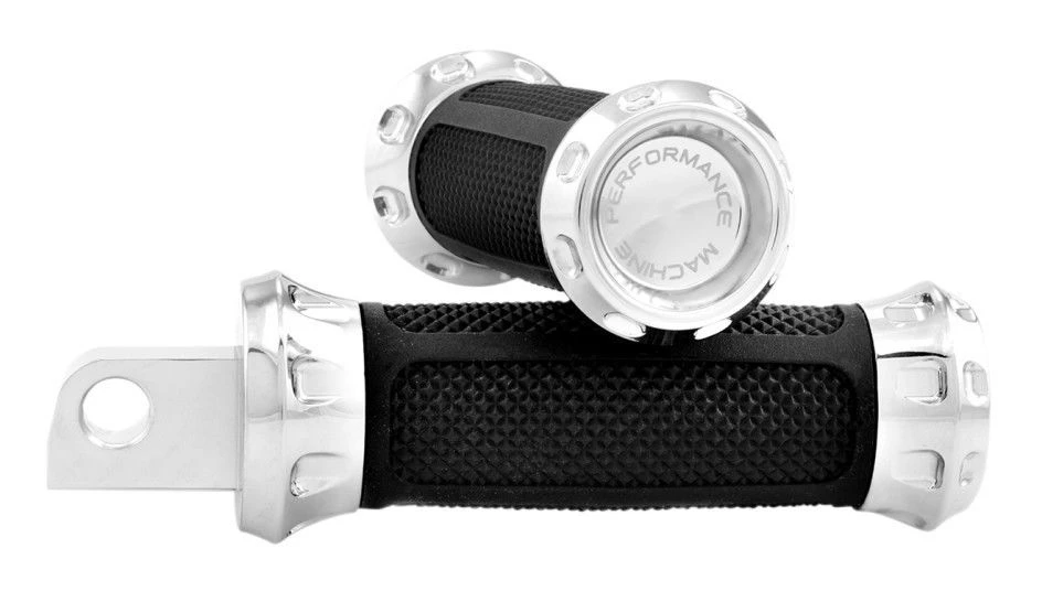 These classy foot pegs are CNC-machined from billet aluminum and are branded with the Performance Machine logo. They are manufactured with durable, knurled rubber that is built for comfort. Available in a variety of styles and finishes with the matching Performance Machine Shift Peg sold separately.